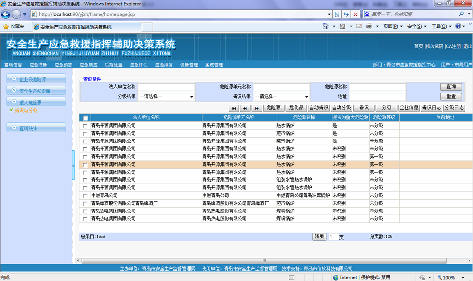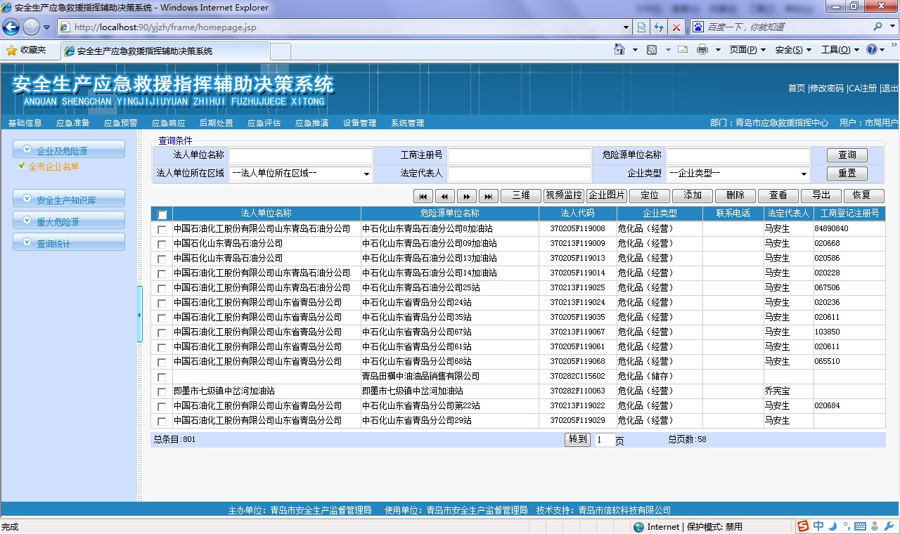 ? 對(duì)存在危險(xiǎn)源的企業(yè)進(jìn)行管理和查詢,可以按地區(qū)、經(jīng)濟(jì)類(lèi)型、所屬行業(yè)等支持多種查詢條件進(jìn)行綜合查詢,查詢結(jié)果提供企業(yè)和所屬危險(xiǎn)源的具體信息、以樹(shù)形結(jié)構(gòu)展示單位基本情況、及其附屬的安全評(píng)價(jià)、行政許可等分類(lèi)信息,方便政府主管部門(mén)查看危險(xiǎn)源企業(yè)的各種動(dòng)態(tài)情況??梢栽诰€查詢調(diào)閱危險(xiǎn)源視頻監(jiān)控信息、三維模型信息、GIS詳細(xì)信息,企業(yè)及危險(xiǎn)源信息可以導(dǎo)出到excel或者word中。