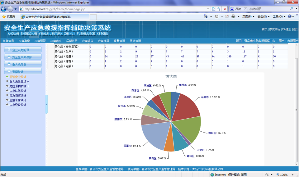 以醒目的報(bào)表形式,對(duì)重大危險(xiǎn)源分布、監(jiān)管企業(yè)、危險(xiǎn)物質(zhì)、應(yīng)急資源進(jìn)行統(tǒng)計(jì)列表展示,并支持多層次頁(yè)面鏈接方式查詢與瀏覽重大危險(xiǎn)源、企業(yè)綜合信息,支持鉆取功能。并在此基礎(chǔ)上進(jìn)行數(shù)據(jù)挖掘和深入分析,查詢結(jié)果既可以顯示為原始的文本數(shù)據(jù)也可以分類(lèi)統(tǒng)計(jì)總和,提供柱狀、餅狀等各種形式的圖形。