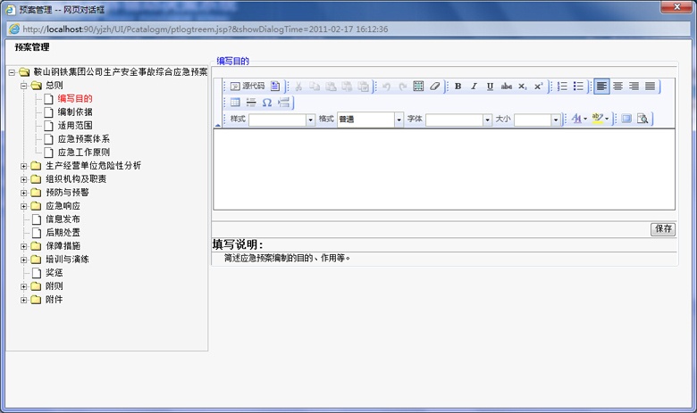 應(yīng)急預(yù)案有綜合應(yīng)急預(yù)案、專(zhuān)項(xiàng)應(yīng)急預(yù)案、現(xiàn)場(chǎng)處置方案構(gòu)成,由于綜合預(yù)案、專(zhuān)項(xiàng)預(yù)案、現(xiàn)場(chǎng)處置預(yù)案的目錄和編制內(nèi)容并不相同,在編制預(yù)案時(shí),編制人員可隨時(shí)讀取預(yù)案模板或案例進(jìn)行參考,系統(tǒng)并可提示幫助信息,輔助完成預(yù)案的編制、修訂。