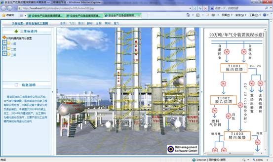 系統(tǒng)集成三維模型子系統(tǒng),根據(jù)企業(yè)名稱或者關(guān)鍵設(shè)備智能關(guān)聯(lián)到三維模型頁(yè)面。如下圖所示,左側(cè)菜單顯示當(dāng)前企業(yè)所有的三維模型標(biāo)準(zhǔn)件,右側(cè)顯示裝置生產(chǎn)流程示意圖,點(diǎn)擊菜單或者流程圖節(jié)點(diǎn)皆可直接切換到相關(guān)視點(diǎn)。