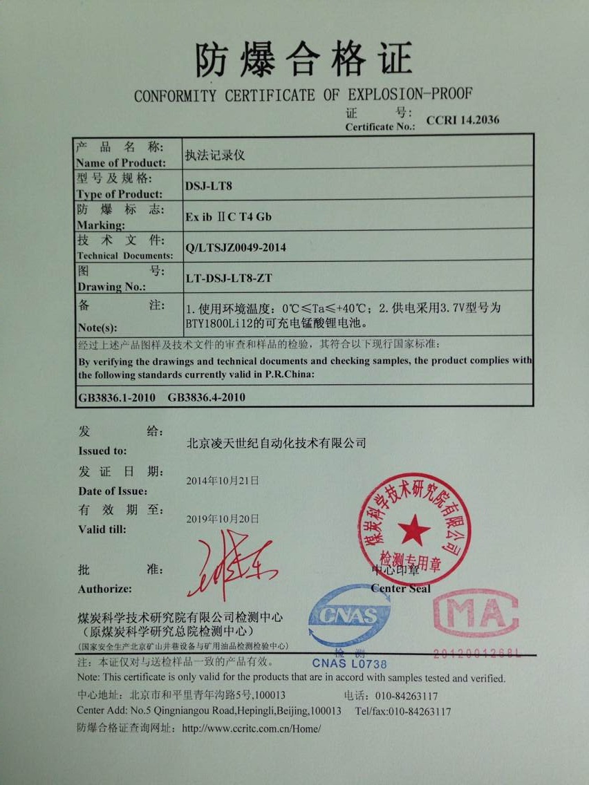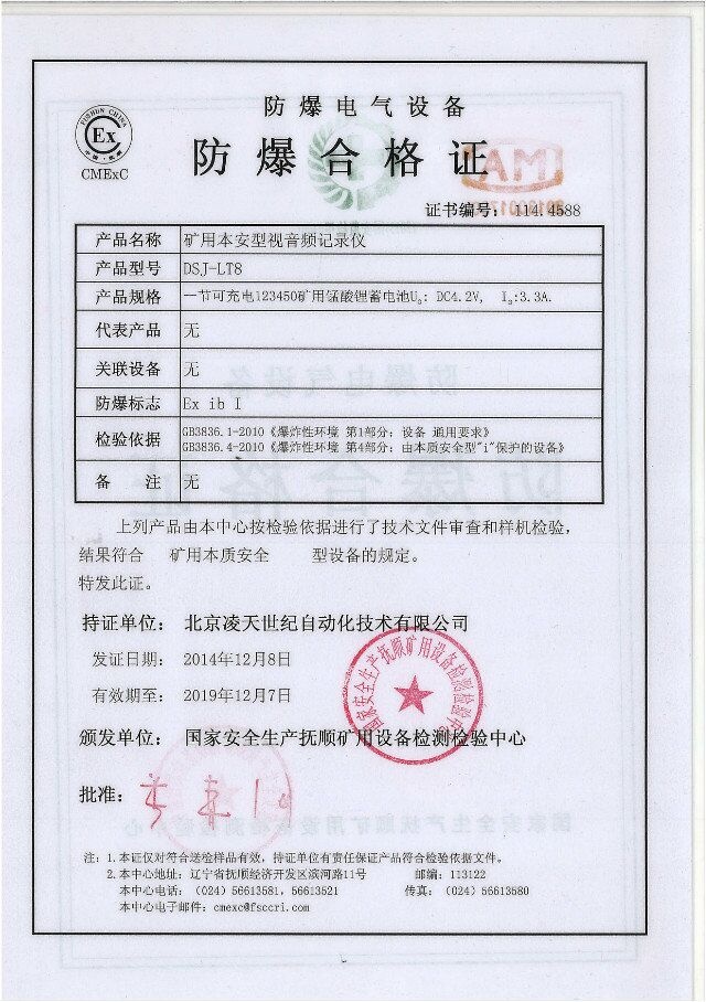 北京凌天防爆執(zhí)法記錄儀取得3c強制性認證、化工防爆、煤礦防爆、MA