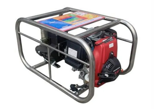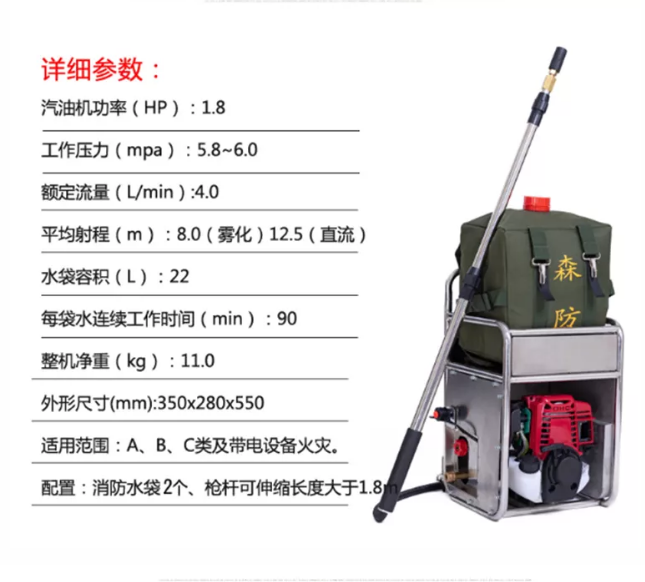 不銹鋼架,便于攜行。泵軸水平布置,減少震動 水泵泵體為柱塞液壓隔膜泵。允許砂石顆粒通過,對水質(zhì)要求低,對發(fā)動機功率損耗小。 泵組可在橫向、縱向傾斜達到25°時正常工作。 水帶直徑40mm,爆破壓力18MPa,表層滌綸長絲,內(nèi)襯進口橡膠,高壓森林接口連接。 水泵配備的動力裝置為強制風(fēng)冷四沖程汽油機。