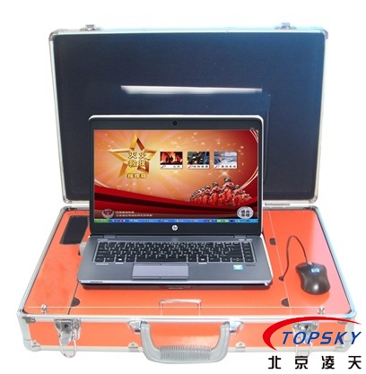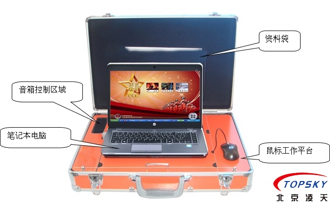 開式手提箱結(jié)構(gòu),箱體上蓋部分為資料存放處,下箱體部分的上層為筆記本電腦操作平臺,右側(cè)為鼠標(biāo)工作平臺,左側(cè)為音箱控制區(qū)域,下箱體的下層部分為一起設(shè)備存放區(qū)域;