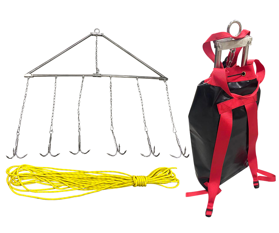 滾鉤整體為不銹鋼材質(zhì),鉤體采用三爪錨鉤,用于水下搜索溺水人員。整體三角可拆卸式,三角架經(jīng)過(guò)靜載荷性能測(cè)試:承重220KG。材質(zhì):304不銹鋼材質(zhì);一套滾鉤24 枚, 鉤體:為三爪倒鉤形式,鉤體粗3mm、長(zhǎng)度100mm,鉤與鉤間距15cm;主繩:長(zhǎng)1500mm,直徑12mm。