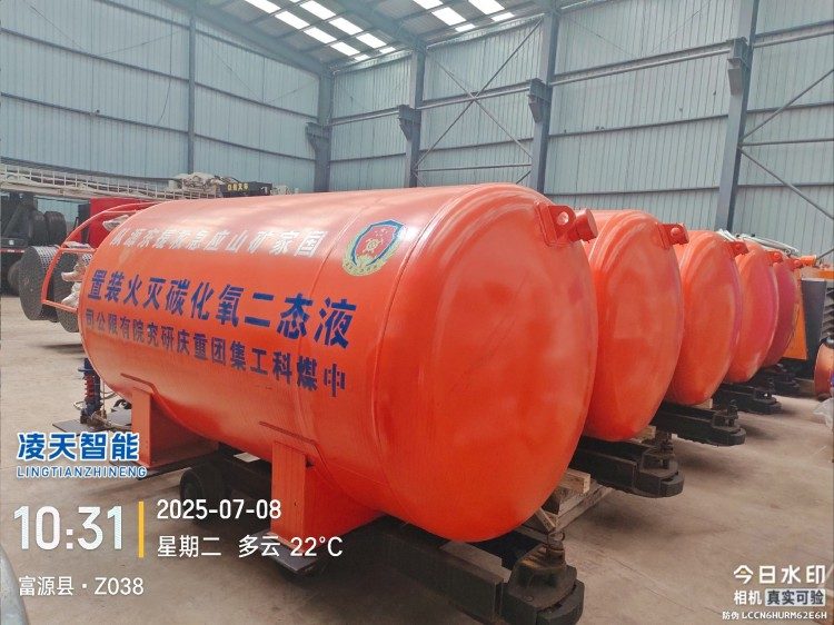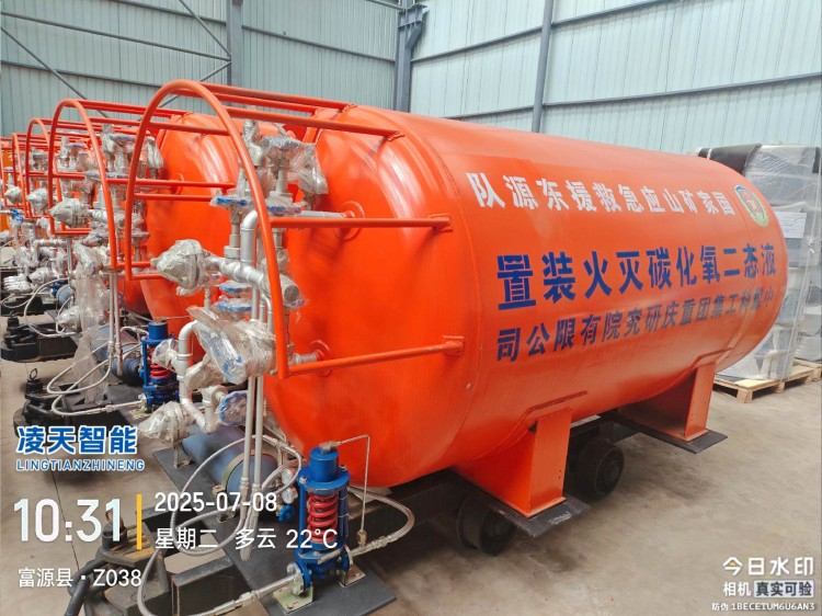 液態(tài)二氧化碳滅火裝置,采用平板車為運(yùn)載平臺,搭載液態(tài)二氧化碳滅火模塊,采用液態(tài)二氧化碳為滅火劑,運(yùn)輸至井下火區(qū)近附,經(jīng)自增壓調(diào)控系統(tǒng)實現(xiàn)罐內(nèi)穩(wěn)壓,并通過遠(yuǎn)距離輸送管路將液體從罐內(nèi)向密閉火區(qū)噴射,利用其急速膨脹氣化和吸熱效率高的物理特性,可實現(xiàn)惰性降氧,吸熱降溫,吸附阻化等功能,從而可快速進(jìn)行井下煤層自燃火災(zāi)的預(yù)防與撲滅等。