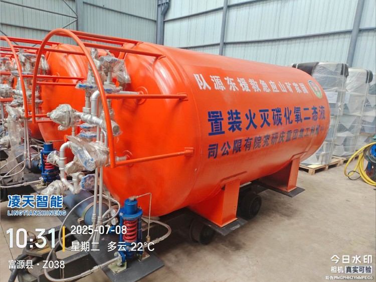 采用液態(tài)二氧化碳為滅火劑,運(yùn)輸至井下火區(qū)近附,經(jīng)自增壓調(diào)控系統(tǒng)實現(xiàn)罐內(nèi)穩(wěn)壓,并通過遠(yuǎn)距離輸送管路將液體從罐內(nèi)向密閉火區(qū)噴射,利用其急速膨脹氣化和吸熱效率高的物理特性,可實現(xiàn)惰性降氧,吸熱降溫,吸附阻化等功能,從而可快速進(jìn)行井下煤層自燃火災(zāi)的預(yù)防與撲滅等