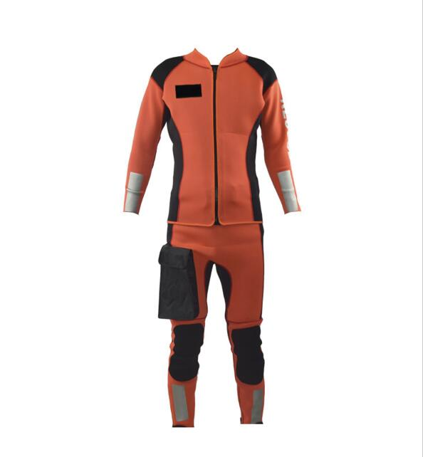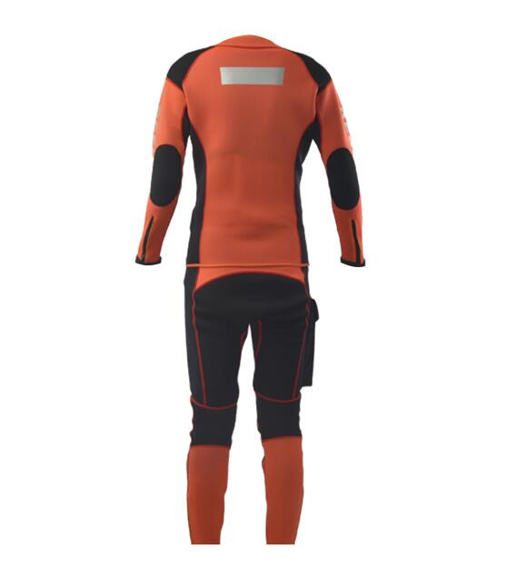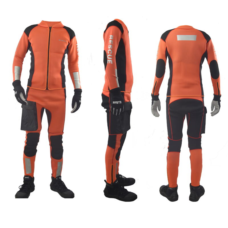 水域救援專用分體式濕式服,前開拉鏈長袖上衣和中腰褲兩件套。3mm高彈氯丁橡膠面料制作,相拼3mm超彈氯丁橡膠面料,有效的提升運動的自由度。無極調(diào)節(jié)尼龍戰(zhàn)術(shù)腰帶和高強度塑鋼插扣,防止衣服滑落。右腿外側(cè)設(shè)有一個防水尼龍面料立體口袋,臀部一片式、護膝、護肘易摩擦部位,均采用彈性聚酯纖維復(fù)合面料,增加救援服的耐磨性。衣袖、褲口及背后都設(shè)有彈性反光帶。領(lǐng)口、袖口及褲口處YKK拉鏈開合。