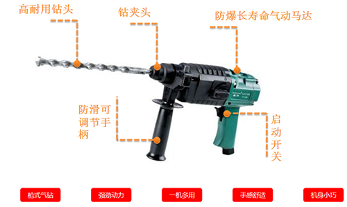 主要用于巖石,磚墻,混凝土等構件上鑿孔,作安裝管道、架設動力線路、安裝地腳螺栓、化工廠、精煉廠、建筑、重工業(yè)、危險潮濕的隧道、水下及狹窄的空間作業(yè);尤其在高瓦斯防爆礦井中,氣動防爆無火花更能體現(xiàn)安全性。它是提高工效,減輕勞動強度的工具.