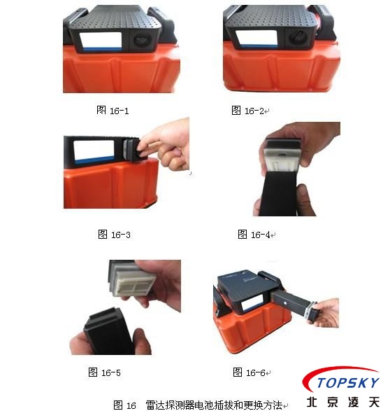 YSR25本安型雷達(dá)生命探測(cè)儀的雷達(dá)探測(cè)器配備了兩塊可充電鋰離子電池,其插拔、更換步驟如下,見圖16。