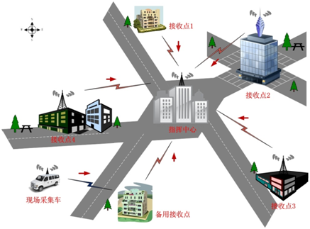 前端現場采集車安裝大功率車載設備在城市各區(qū)內巡邏,實時將采集的音視頻信息傳給就近接收點,接收點用微波、光纖或專網等設施傳輸給指揮中心。
